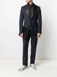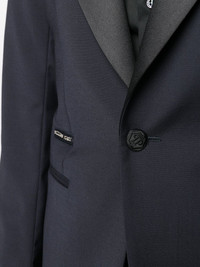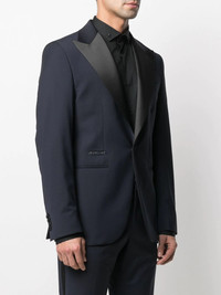 slim-cut Iconic blazer navy blue wool classic lapels front button fastening long sleeves chest welt pocket two front welt pockets Made in Italy Composition Lining: Viscose 51%, Acetate 49% Outer: Polyester 53%, Wool 43%, Spandex/Elastane 4% Washing instructions Dry Clean Only