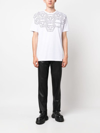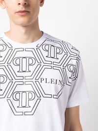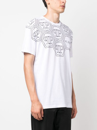 SS Hexagon round-neck T-shirt Highlights - Optical white - Cotton - Monogram print - Logo print at the chest - Silver-tone logo plaque - Round neck - Short sleeves - Straight hem Imported Composition Cotton 100%, Polyester 100% SIZE & FIT Model measurements Height 6 ft 2 in(1.87 m) Bust/Chest 36.41 in(92.5 cm) Hips 35.43 in(90 cm) Waist 29.52 in(75 cm) FittingInformation Designed for a relaxed fit, this piece allows for comfort and movement when worn Made from a midweight non-stretch fabric, this piece offers minimal elasticity when worn This piece fits true to size – take your usual size