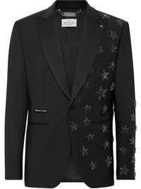 Stars wool blazer Highlights - Black - Front button fastening - Two side slit pockets - Star patch detail - Rhinestone embellishment Made in Italy Composition Outer: glass 100%, Resin 100%, Polyester 53%, Wool 43%, Elastane 4% Lining: Acetate 52%, Viscose 48%