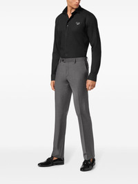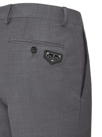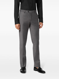 straight-leg wool-blend trousers Highlights - Grey - Cotton-virgin wool blend - Tailored design - Logo patch to the rear - Mid-rise - Belt loops - Concealed fly and button fastening - Two side slit pockets - Two rear welt pockets Made in Italy Composition Outer: Polyester 53%, Virgin Wool 43%, Elastane 4% Lining: Polyester 65%, Cotton 35%