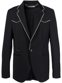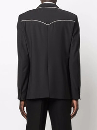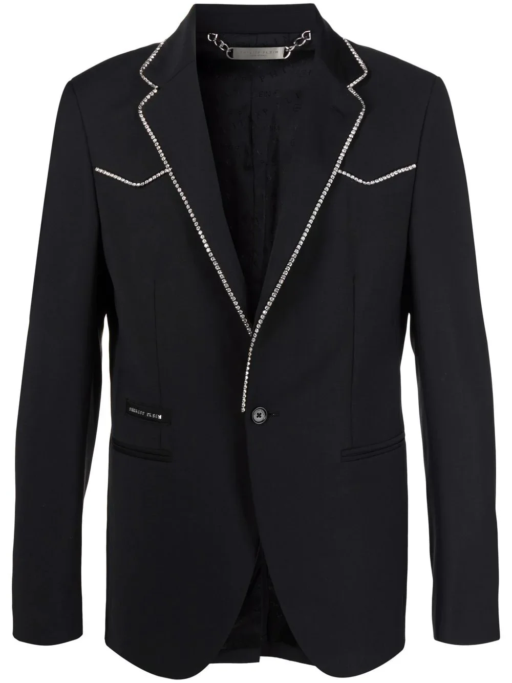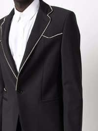 Strass Gigolo fit blazer black wool blend crystal embellishment notched lapels front button fastening two front welt pockets long sleeves logo-print lining Made in Italy Composition Outer: Crystal 100%, Polyester 53%, Wool 43%, Elastane 4% Lining: Viscose 51%, Acetate 49% SIZE & FIT Model measurements Height 6 ft 2 in(1.87 m) Bust/Chest 36.41 in(92.5 cm) Hips 37 in(94 cm) Waist 29.52 in(75 cm) FittingInformation This piece fits true to size. We recommend you get your regular size Cut for a slim fit Made with a mid-weight stretch fabric Washing instructions Dry Clean Only
