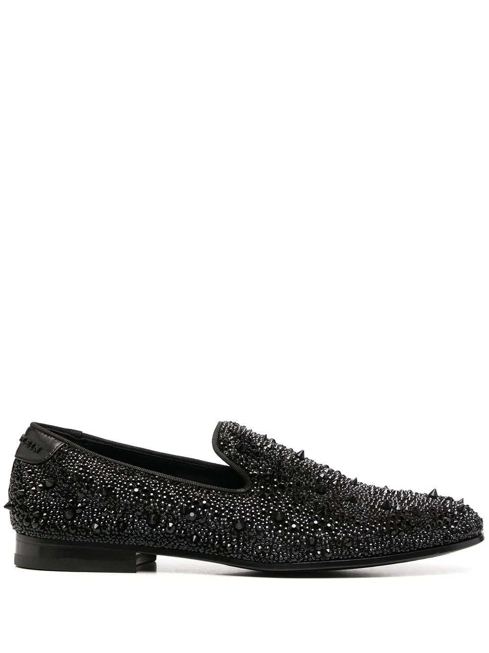 crystal-accented moccasins black leather almond toe slip-on style branded insole crystal embellishment spike stud detailing silver-tone logo lettering low heel Made in Italy Composition Outer: Calf Leather 100% Lining: Calf Leather 100% Sole: Calf Leather 100% SIZE & FIT Measurement HEEL 0.98 in(2.5 cm) Sole height 0.39 in(1 cm)