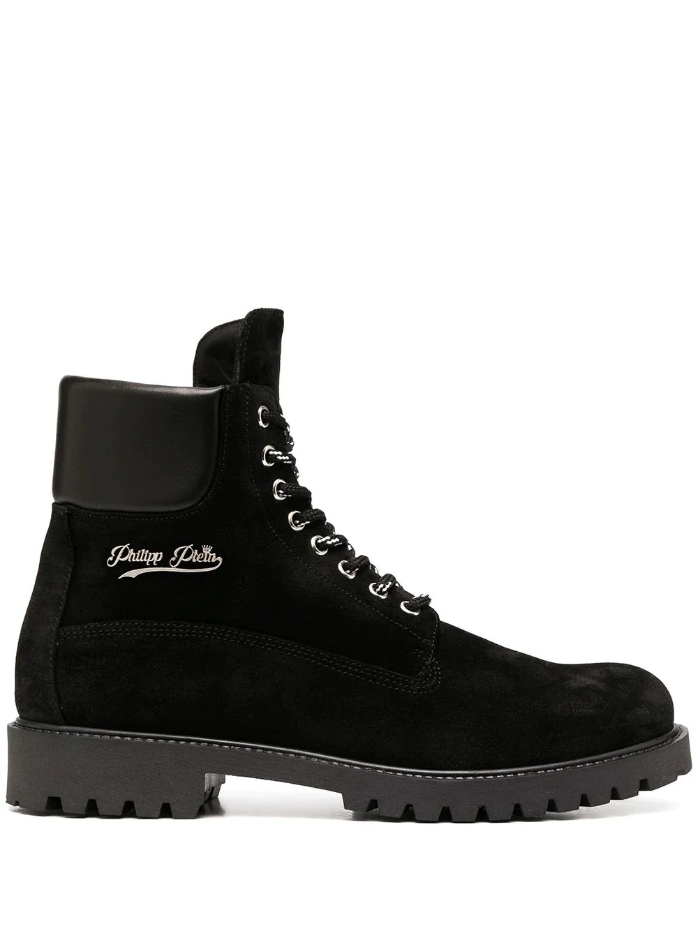 suede ankle boots black leather/suede logo plaque round toe front lace-up fastening ankle-length ridged rubber sole Made in Italy Composition Outer: Leather 100%, Suede 100% Lining: Leather 100% Sole: Rubber 100% SIZE & FIT Measurement HEEL 1.57 in(4 cm) HEIGHT 5.9 in(15 cm) Sole height 0.98 in(2.5 cm)