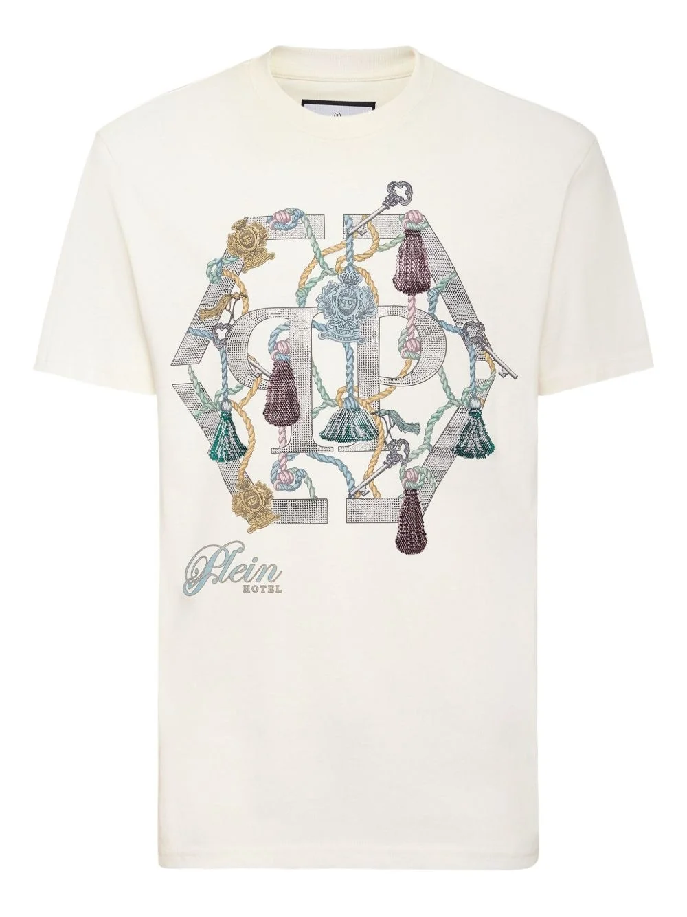 tassel-embellished logo T-shirt Highlights - Off-white - Cotton fabric - Hexagonal logo - Tassel embellishments - Rope motif - Key motif Imported Composition Cotton 100% Washing instructions Read Manufacturer Guidelines