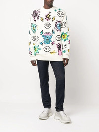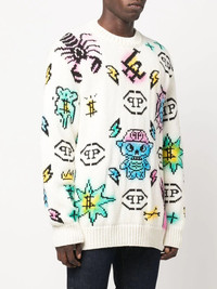 Tattoo Monogram knitted jumper Tattoo Monogram knitted jumper from PHILIPP PLEIN featuring multicolour, wool, knitted construction, ribbed-knit edge, monogram jacquard, crew neck, long sleeves and straight hem. Made in Italy Composition Wool 41%, Polyamide 34%, Cotton 25% SIZE & FIT Model measurements Height 6 ft 0 in(1.84 m) Bust/Chest 35.82 in(91 cm) Hips 37 in(94 cm) Waist 28.34 in(72 cm) FittingInformation This piece fits true to size. We recommend you get your regular size Cut for a relaxed fit Made with a mid-weight fabric Washing instructions Hand Wash