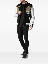 tattoo-patches bomber jacket Philipp Plein updates the sporty nature of this black and white varsity jacket with tattoo patches. Colourfull versions of the motifs are appliqued randomly across the front and back for a distinctive touch. Highlights - Black - Applique detail - Ribbed detailing - Stand-up collar - Front button fastening - Two diagonal pockets to the sides - Long sleeves - Straight hem Imported Composition Outer: Calf Leather 100%, Polyester 64%, Viscose 33%, Elastane 3% Lining: Polyester 98%, Elastane 2% Filling: Polyester 100%