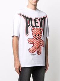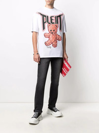 White/red cotton teddy bear print T-shirt from PHILIPP PLEIN featuring teddy bear print, all-over logo print, crew neck, short sleeves and straight hem. Highlights - White/red - Cotton - Teddy bear print - All-over logo print - Crew neck - Short sleeves - Straight hem Made in Italy Composition Cotton 100%