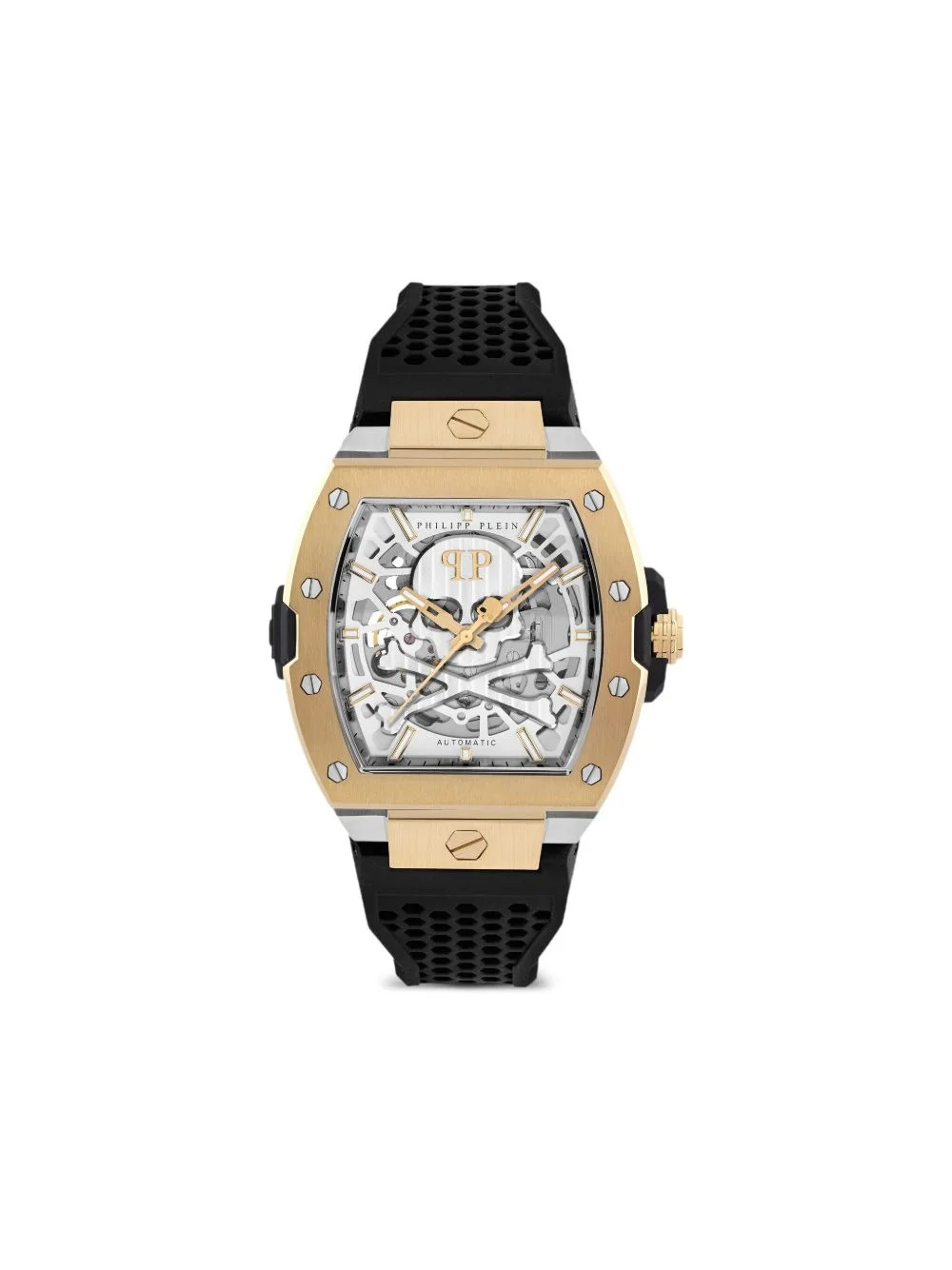 The $keleton 2.0 44mm Highlights - 44mm - Silver-tone - Stainless steel - Tonneau face - Skeleton dial - Guilloche dial - Crystal index - Baton hands - Central hours, minutes and seconds - Screw-down crown - Skeleton case back - Automatic movement - Rubber strap - Pin-buckle fastening - Water resistance up to 50m/5 atm - This item comes with a standard one-year warranty from the brand. Imported Composition stainless steel 100%, Yellow Gold Plated Stainless Steel 100%, Silicone 100%, Mineral Glass 100% SIZE & FIT Measurement DIAMETER 1.73 in(4.4 cm) Thickness 0.5 in(1.2 cm)