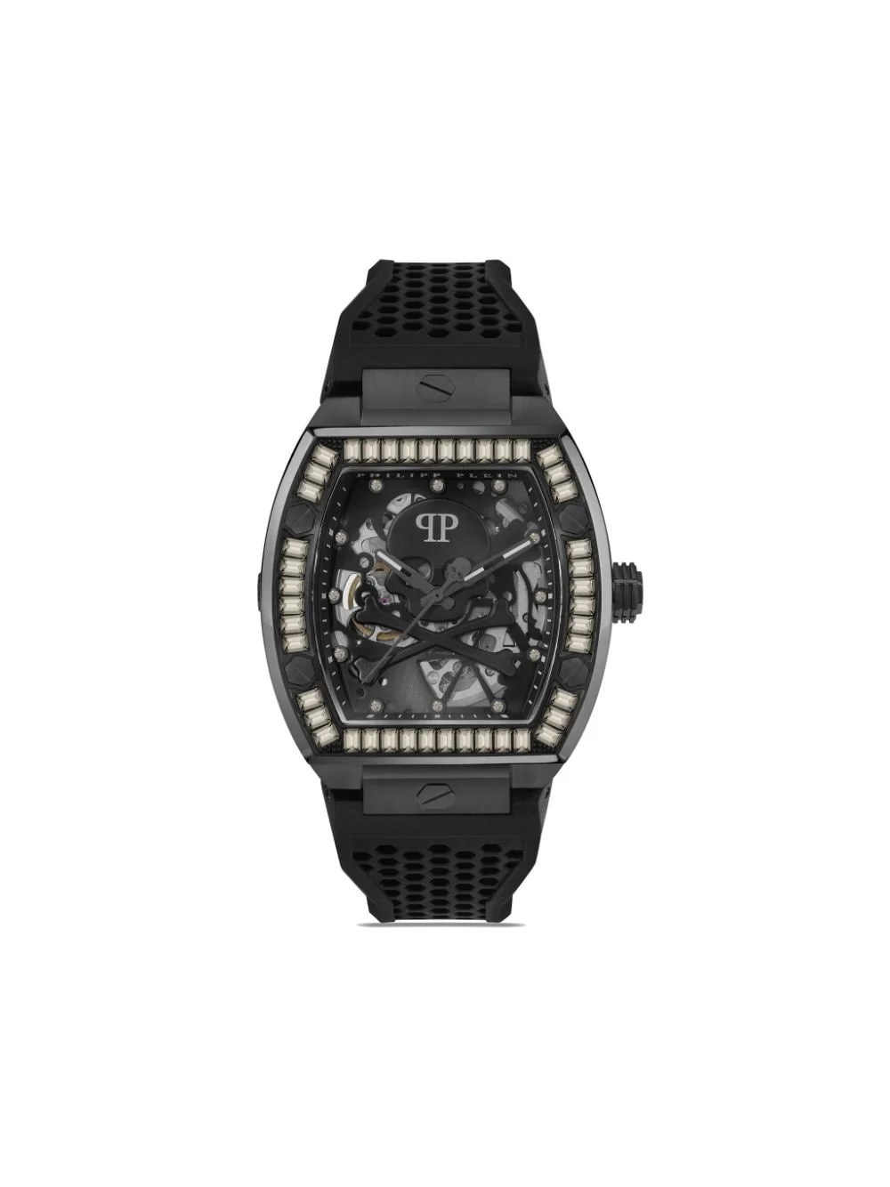 The $keleton 44mm Philipp Plein's iconic $keleton collection started as a sneaker line and has since made its way into the world of watchmaking. The $keleton 44mm is a automatic-powered timepiece with an intricate skeleton dial that offers the same futuristic and forward-thinking inspiration the brand is known for. Highlights - Stainless steel - Automatic movement - Crystal index - Skeleton dial - Black - Skull applique - Tonneau face - Skeleton case back - Crystal-encrusted bezel - Black - Rubber strap - Pin-buckle fastening - Central hours, minutes and seconds - Water resistance up to 50m/5 atm - Original box included. - This item comes with a standard one-year warranty from the brand. Made in Italy Composition stainless steel 100%, Mineral Glass 100%, Silicone 100%