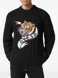 tiger-applique wool jumper Highlights - Black/multicolour - Wool - Chunky cable knit - Ribbed-knit edge - Applique detail - Signature tiger head motif - Crew neck - Long sleeves - Straight hem Made in Italy Composition Wool 100%