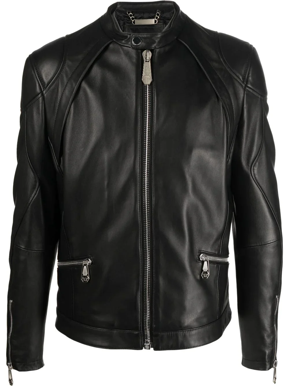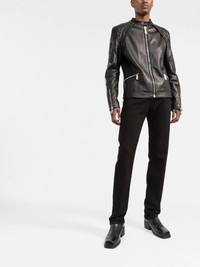 zip-through biker jacket black/silver leather front zip fastening two zip-fastening pockets zip-fastening compartment silver-tone logo plaque Made in Italy Composition Outer: Leather 100% Lining: Viscose 100% SIZE & FIT Model measurements Height 6 ft 2 in(1.88 m) Bust/Chest 35.03 in(89 cm) Hips 35.82 in(91 cm) Waist 27.95 in(71 cm) Washing instructions Specialist Cleaning
