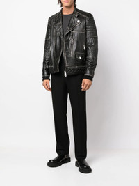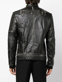 logo-plaque leather biker jacket logo-plaque leather biker jacket from PHILIPP PLEIN featuring jet black, logo plaque, front zip fastening, long sleeves, two side zip-fastening pockets and leather-blend. Imported Composition Outer: Calf Leather 100% Lining: Polyester 100% SIZE & FIT Model measurements Height 6 ft 2 in(1.89 m) Bust/Chest 37.79 in(96 cm) Hips 37 in(94 cm) Waist 29.92 in(76 cm) FittingInformation This piece fits true to size. We recommend you get your regular size Cut for a slim fit Made with a heavyweight non-stretch fabric Washing instructions Specialist Cleaning