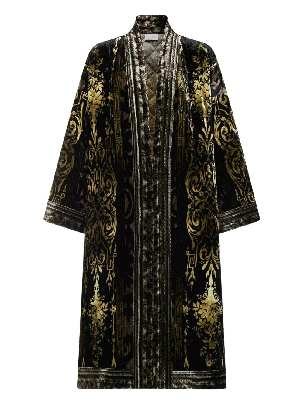 baroque-print velvet coat Highlights - Black - Velvet texture - Gold baroque print - Open front - Three-quarter sleeves - Straight hemline Imported Composition Fabric 100% Washing instructions Read Manufacturer Guidelines