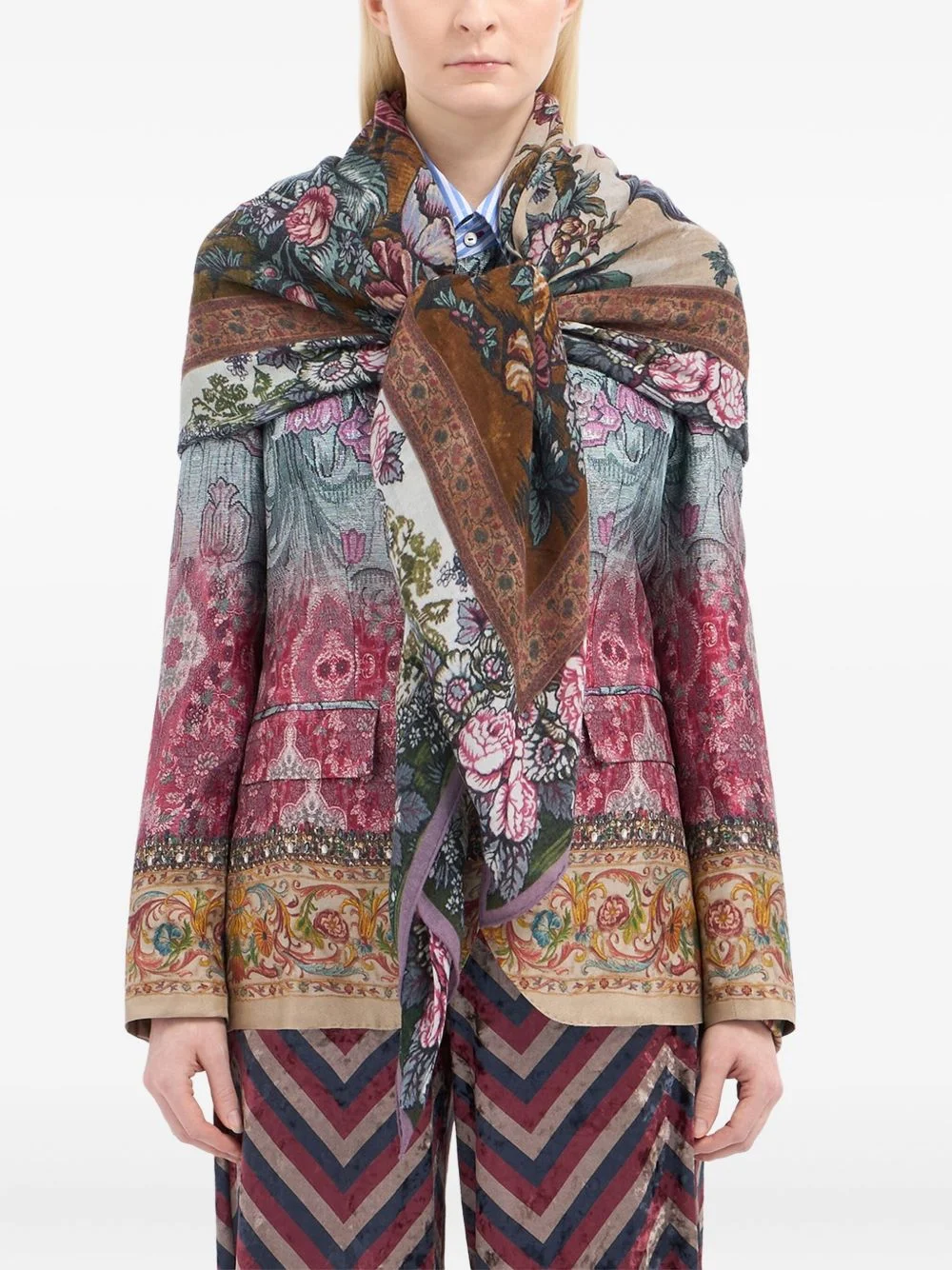 floral-pattern square scarf Highlights - Black - Floral pattern - Purple border - Wool - Square shape Imported Composition Wool 100% SIZE & FIT Measurement LENGTH 53.14 in(135 cm) WIDTH 53.14 in(135 cm) Washing instructions Read Manufacturer Guidelines