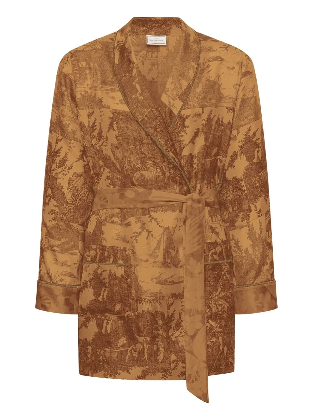 landscape-print belted robe Highlights - Golden brown - Landscape print - Shawl collar - Self-tie belt - Long sleeves - Piped trim Imported Composition Fabric 100% Washing instructions Read Manufacturer Guidelines