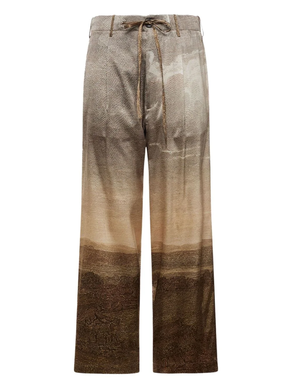 THE LANDSCAPE-PRINT DRAWSTRING-WAIST TROUSERS OFFER CONTEMPORARY STYLE WITH PRACTICAL COMFORT. A STRIKING BROWN AND BEIGE LANDSCAPE PRINT ADDS VISUAL INTEREST TO YOUR WARDROBE, WHILST THE DRAWSTRING WAIST PROVIDES ADJUSTABLE FIT FOR ALL-DAY EASE. PLEATED FRONT DETAILING CREATES A REFINED SILHOUETTE THAT FLATTERS THE FRAME AND ALLOWS FREEDOM OF MOVEMENT. VERSATILE ENOUGH FOR CASUAL SETTINGS YET POLISHED ENOUGH FOR RELAXED PROFESSIONAL ENVIRONMENTS, THESE TROUSERS BRIDGE THE GAP BETWEEN COMFORT AND SOPHISTICATION.
