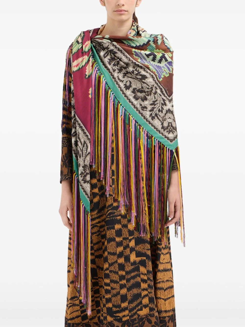 patterned fringed scarf Highlights - Dark red - Multicolored fringe - Geometric pattern - Floral pattern - Silk Imported Composition Silk 100% SIZE & FIT Measurement LENGTH 53.14 in(135 cm) WIDTH 53.14 in(135 cm) Washing instructions Read Manufacturer Guidelines