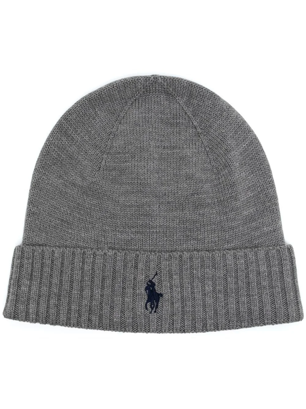 embroidered-logo ribbed beanie light grey/navy blue wool embroidered logo to the front ribbed hem turn-up narrow brim Imported Composition Wool 100% Washing instructions Machine Wash