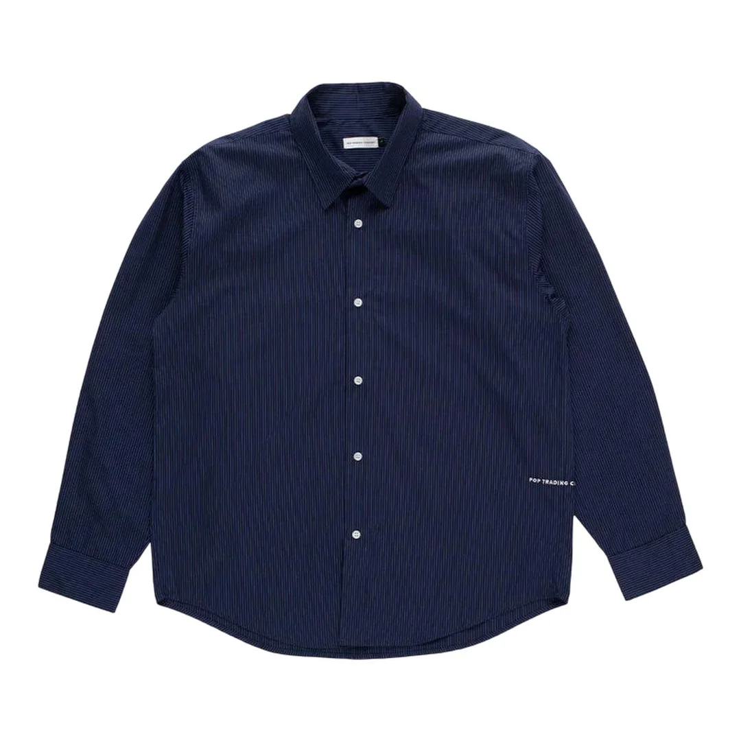300049017NVY-SS / A5POPAW25_03-008/00/NAVY - Premium corduroy construction - Vertical stripe texture - Embroidered Pop Trading Co. logo - Classic point collar - Long sleeves with barrel cuffs - Button-front closure with white buttons - Relaxed fit - Curved hem Pop Trading Company Striped Logo Shirt delivers classic streetwear styling with refined Dutch craftsmanship. Made from premium corduroy fabric in deep navy with subtle vertical striping throughout, featuring the brand's signature embroidered logo. The relaxed fit and quality construction create a versatile piece that bridges casual and elevated streetwear aesthetics.