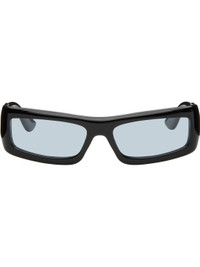 Handcrafted rectangular cellulose acetate-frame sunglasses. · Blue lenses · 100% UVA/UVB protection · Integrated nose pads · Signature rivets at temples · Includes pouch · Size: 58.17 137 Part of the Bast collection. Supplier color: Black/Rif Blue Acetate. Made in Japan 252458M134007