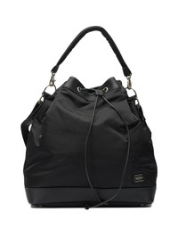 drawstring leather shoulder bag Highlights - Black - Leather trim - Drawstring fastening - Top handle - Shoulder strap - Metal hardware Imported Composition Nylon 70%, Leather 30%