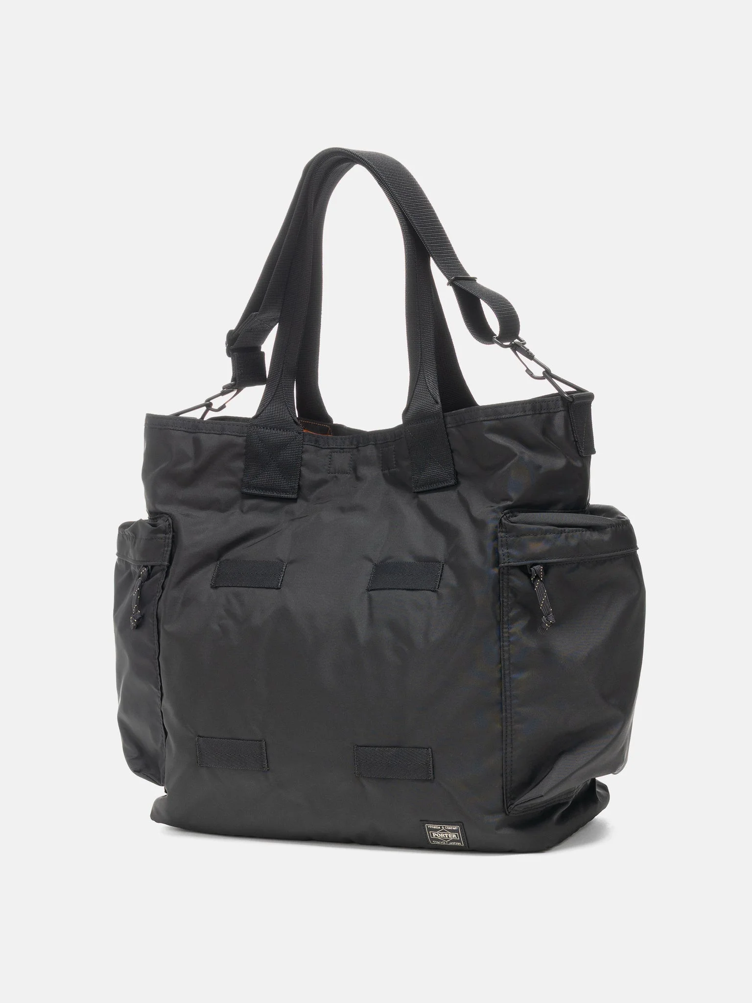 The PORTER FORCE 2Way Tote Bag delivers military-inspired utility in a durable, everyday design. Made in Japan from tough 210-denier nylon, it offers dependable performance with a lightweight feel. Dual zip side pockets, a spacious main compartment with smart internal dividers, and a removable accessory sleeve keep essentials organized and easy to reach. Finished with a detachable shoulder strap and PORTER’s signature woven label, it’s a versatile tote built for commuting, travel, or weekend carry. DETAILS - #855-07500 - 100% Nylon - Exterior side pockets (zippered) - Canvas handles - Detachable shoulder straps - Large main compartment / snap closure - Interior sleeves - Interior detachable case - Made in Japan