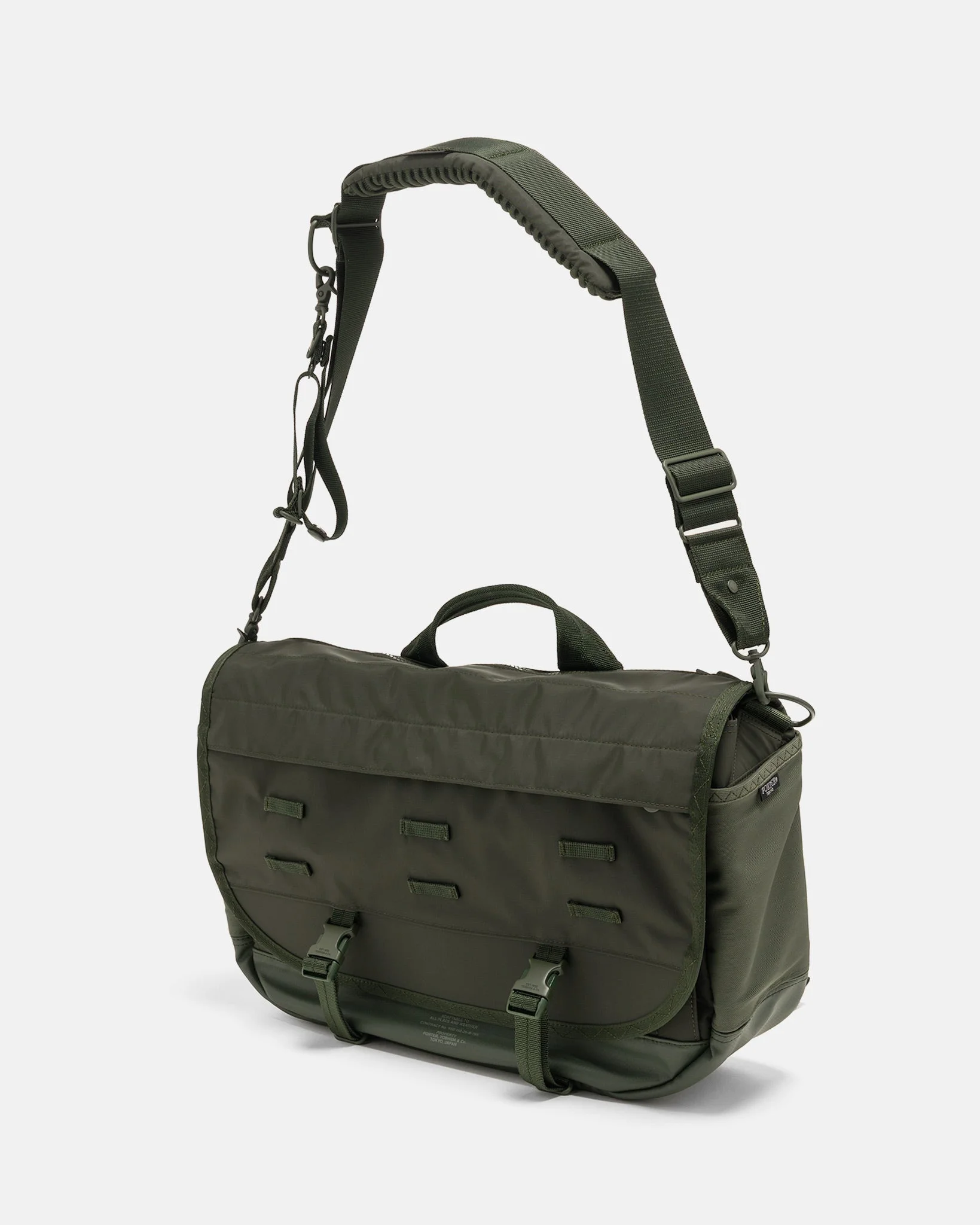 The PORTER Monochrome Messenger Bag refines a classic silhouette with advanced functionality and resilient construction. Made from waterproof three-layer nylon taffeta with a breathable Cubic Eye® mesh back, it’s built to handle sudden shifts in weather with ease. The flap opens with Velcro or a joint strap for flexible access, while a top zip allows direct entry to the main compartment. Inside, it features a padded sleeve for a 16-inch laptop and a sling binder for intuitive organization—making it a versatile companion for daily use. DETAILS - 755-19846 - 100% Nylon - Exterior: High density 3L nylon taffeta - Lining: Nylon ox - Water-repellent coating - Cubic Eye® Pique Light back padding - Dual entry flap closure - Velcro or joint strap - Top zipper access to main compartment - Water-resistant zippers - Adjustable padded shoulder strap - One-touch adjustable strap system - MOLLE system at front panel - Front zip pocket - Side mesh pockets - Cushioned internal sleeve for 16" laptop - Internal sling binder - 16L capacity - Made in Japan