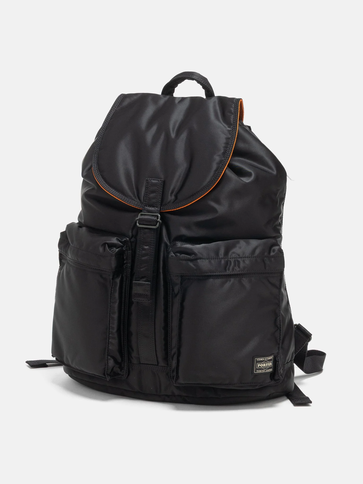 The PORTER TANKER Rucksack brings the updated plant-based Tanker fabric to a classic pack silhouette, keeping the lightweight feel, soft hand, and signature rescue-orange lining. Refined hardware and upgraded details improve durability and ease of use while preserving the clean, utilitarian look of the original. A wide drawstring opening and side zipper provide quick access to the main compartment, making packing and retrieval effortless. The flap is finished with PORTER’s distinctive triple stitching, applied carefully by skilled craftsmen for a quietly elevated touch. DETAILS - 622-01630-10 - 100% Biomass nylon twill - Lining: Recycled nylon taffeta - Contrast nylon lining - 14L capacity - Large main compartment - Top flap and buckle closure - Drawcord fastening - Side zip access - Snap fastened internal divider - Padded shoulder straps - Self fabric, padded carry handle - Two front zip pockets - Made in Japan