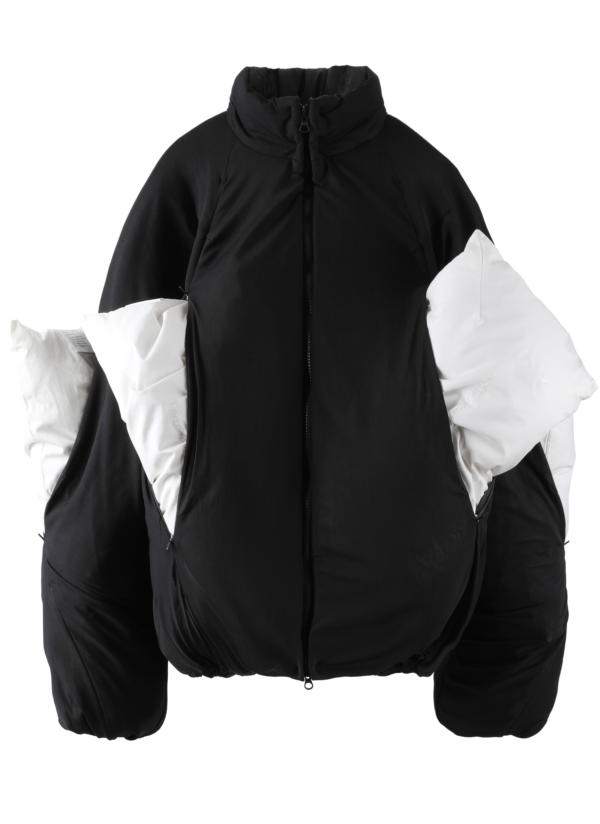 Down jacket that transforms its silhouette by adding the pillow under the mesh layer. The shape dramatically changes by numbers and location of the pillows added. Brand embroidery applied on every pillow. Stretchable and durable fine mesh fabric. YKK zipper at front. 4 YKK CONCEAL® closure at front. 2 YKK CONCEAL® closure at each arm. 2 YKK CONCEAL® closure at back. Hem adjustment system with elastic string and logo engraved stopper. 5 Goose down pillow included with various sizes. (1 Large, 2 Medium, and 2 Small size) 메쉬 레이어 속에 베개를 추가하여 실루엣을 변형시킬 수 있는 다운 자켓. 추가되는 베개의 개수와 위치에 따라 극적으로 변형되는 형태. 모든 베개에 브랜드 로고 자수 마감. 신축성과 내구성이 우수한 촘촘한 메쉬 소재. 전면에 YKK 지퍼. 전면에 4개의 YKK CONCEAL® 지퍼. 각 팔에 2개의 YKK CONCEAL® 지퍼. 후면에 2개의 YKK CONCEAL® 지퍼. 엘라스틱 스트링과 브랜드 로고 각인 스토퍼를 활용한 밑단 사이즈 조절 시스템. 다양한 사이즈의 구스다운 베개 5개 포함. (대형 1개, 중형 2개, 그리고 소형 2개) Size(Length/Chest/Arm-Shoulder) XS : 67.5cm/61cm/78cm S : 70cm/66cm/81cm M : 72.5cm/71cm/84cm L : 75cm/76cm/87cm XL : 77.5cm/81cm/90cm THINDOWN® Nylon 80% Elastane 20% Polyester 100% Goose Down 80/20 Cotton 100% Made in South Korea.