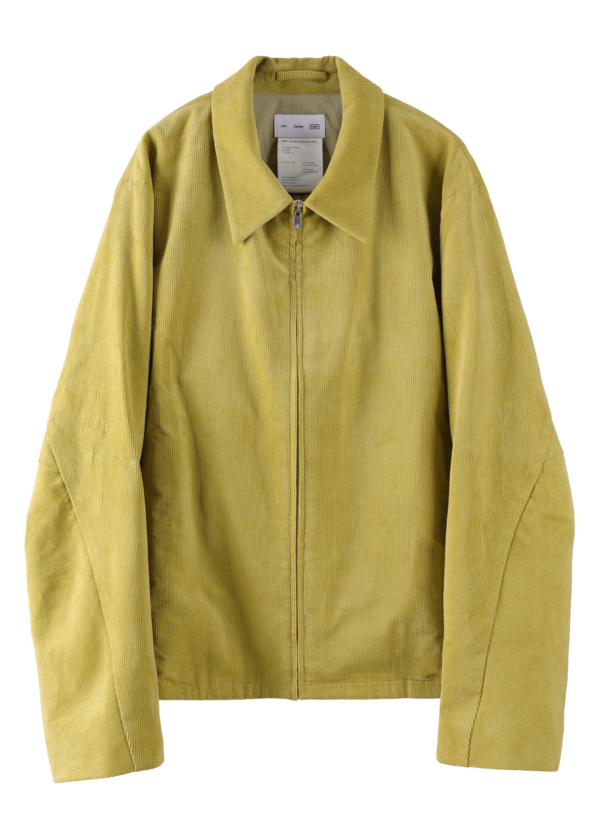 Reinterpretation of the 5.0+ JACKET RIGHT, using corduroy fabric and EXCELLA® zipper, along with improved fit. Three-dimensional elbow pattern creates distinctive silhouette and provides comfortable movement. Warm fine wale corduroy fabric. Standard straight collar. YKK EXCELLA® zipper at front. 2 pockets at front with bartack finish. 2 inner pockets. 5.0+ JACKET RIGHT를 베이스로, 핏을 개선하고 그리고 코듀로이 원단와 엑셀라 지퍼를 통해 재해석. 팔꿈치의 입체패턴을 통한 특징적인 실루엣 형성 및 편안한 활동성 제공. 따뜻한 파인웨일 코듀로이 소재. 스탠다드 카라. 전면에 YKK EXCELLA® 지퍼. 전면에 2개의 포켓과 바텍 마감. 내부에 2개의 이너포켓. Size(Length/Chest/Arm/Shoulder) XS : 59cm/50cm/61cm/39.5cm S : 62cm/52.5cm/63cm/42.5cm M : 65cm/55cm/65cm/45.5cm L : 68cm/57.5cm/67cm/48.5cm XL : 71cm/60cm/69cm/51.5cm Cotton 100% Cotton 68% Polyester 32% Made in South Korea.
