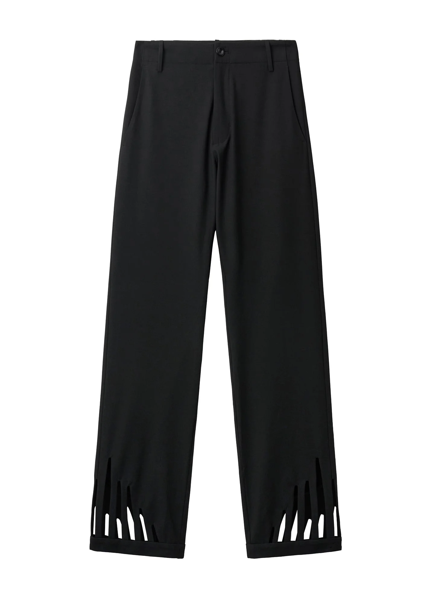Asymmetrically trimmed ankle hem Zip fly, button closure Two hand pockets on front Two welted pockets on back Suit set with Trimmed Jacket (2026) Fabric from South Korea Details YKK EXCELLA® zipper Made in South Korea Composition Body : Polyester 52% Rayon 17% Acetate 15% Modal 10% Elastane 6% Pocket : Cupra 50% Polyester 50% Size Guide Size (Length/Waist/Thigh/Hem) S : 107.5cm/39cm/30.6cm/21cm M : 110cm/41.5cm/32cm/22cm L : 112.5cm/44cm/33.4cm/23cm XL : 115cm/46.5cm/34.8cm/24cm Model height 184cm, size M