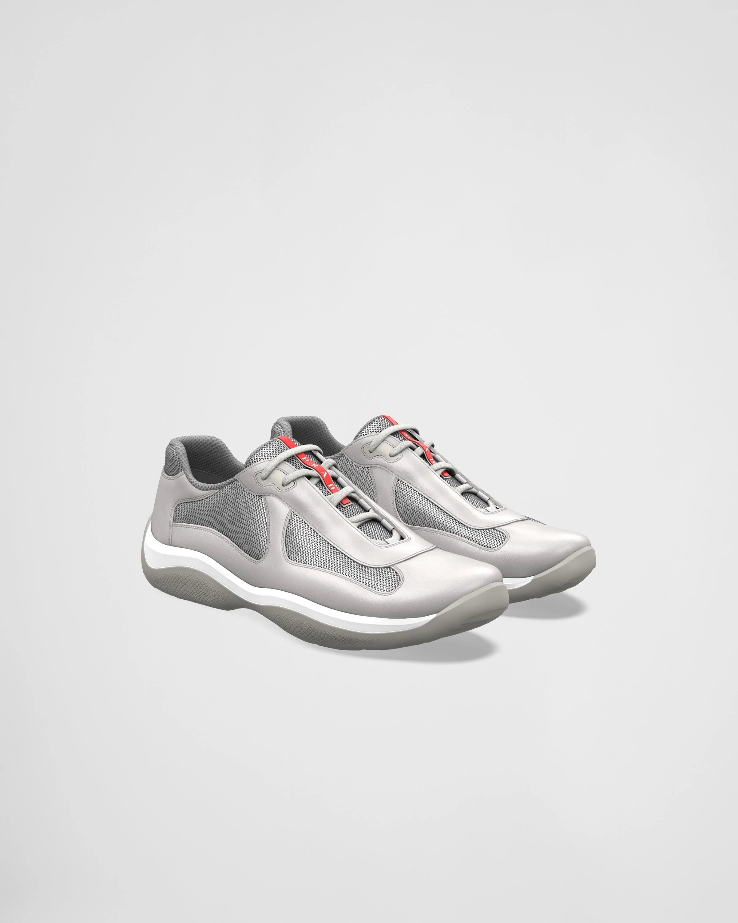 Create your own interpretation of a cult design with the new configuration tool AC Factory. Personalize your Prada America's Cup sneakers by selecting from a wide range of materials and colors and adding your initials. Part of Prada's heritage, this sneaker created in the 1990s for the Luna Rossa team is now repurposed with the same silhouette, details, and materials of the original style. Soft yet durable leather and innovative, breathable bike fabric combine in this design inspired by the sailing world. - Product code: PS906_3LK7_F02ZT - In leather and bike fabric - Lace-up - Bi-material sole with lens design - Tread with rubber lens design inserts - Sole height 35 mm - Removable suede insole - Prada Linea Rossa logo on the tongue - Imported MATERIALS Fabric/Leather