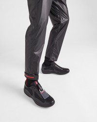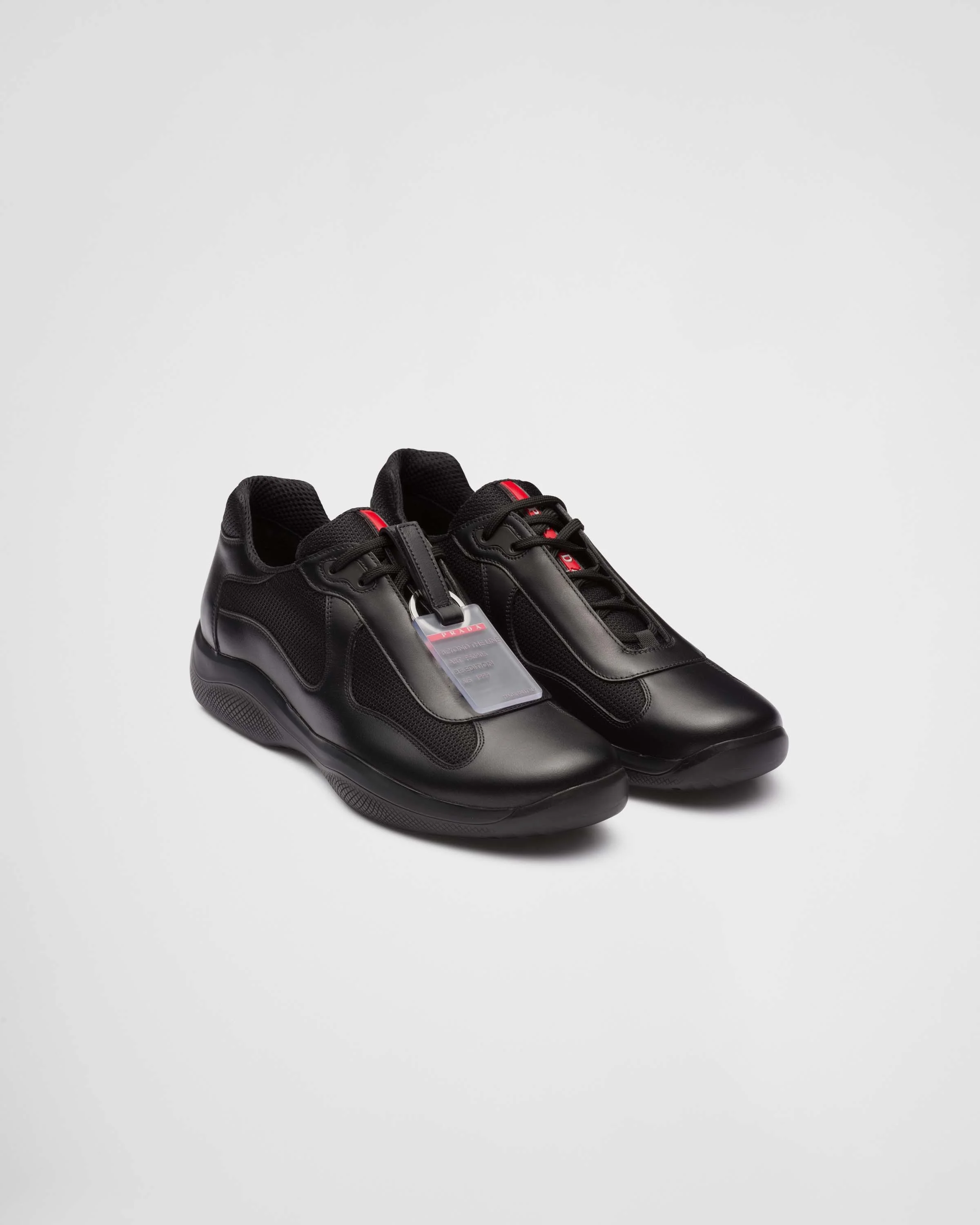 Part of Prada's heritage, the America's Cup sneaker created in the 1990s for the Luna Rossa team is now repurposed with the same silhouette, details, and materials of the original style. Soft yet durable leather and innovative, breathable bike fabric combine in this laced design inspired by the sailing world, completed by an oversized rubber sole. The Prada Linea Rossa logo adds an iconic note, further emphasized by the new 'Beyond the Line' removable tag. - Product code: PS0906_5RU_F0002 - In leather and bike fabric - Lace-up - Bi-material sole with lens design - Tread with rubber lens design inserts - Sole height 35 mm - Removable suede insole - Prada Linea Rossa logo on the tongue - 'Beyond the Line' removable tag displaying the season when the original model was introduced in Prada's collections - Imported MATERIALS Main material: Calfskin