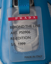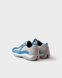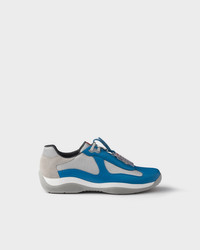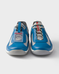Part of Prada's heritage, the America's Cup sneaker created in the 1990s for the Luna Rossa team is now repurposed with the same silhouette, details, and materials of the original style. Soft yet durable leather and innovative, breathable bike fabric combine in this laced design inspired by the sailing world, completed by an oversized rubber sole. The Prada Linea Rossa logo adds an iconic note, further emphasized by the new 'Beyond the Line' removable tag. - Product code: PS0906_5RU_F0013 - In leather and bike fabric - Lace-up - Bi-material sole with lens design - Tread with rubber lens design inserts - Sole height 35 mm - Removable suede insole - Prada Linea Rossa logo on the tongue - 'Beyond the Line' removable tag displaying the season when the original model was introduced in Prada's collections - Imported MATERIALS Main material: Calfskin