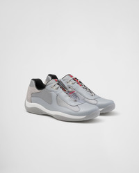 Part of Prada's heritage, the America's Cup sneaker created in the 1990s for the Luna Rossa team is now repurposed with the same silhouette, details, and materials of the original style. Soft yet durable leather and innovative, breathable bike fabric combine in this laced design inspired by the sailing world, completed by an oversized rubber sole. The Prada Linea Rossa logo adds an iconic note, further emphasized by the new 'Beyond the Line' removable tag. - Product code: PS0906_5RU_F0591 - In leather and bike fabric - Lace-up - Bi-material sole with lens design - Tread with rubber lens design inserts - Sole height 35 mm - Removable suede insole - Prada Linea Rossa logo on the tongue - 'Beyond the Line' removable tag displaying the season when the original model was introduced in Prada's collections - Imported MATERIALS Main material: Calfskin