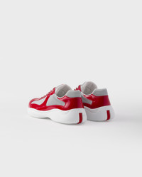 These patent leather sneakers with bike fabric inserts are inspired by an iconic aesthetic. The unmistakable Prada Linea Rossa logo on the tongue and sole enhances the design. - Product code: 4E3400_ASZ_F0F5C_F_G000 - Upper: patent leather and technical fabric - Prada Linea Rossa logo on the tongue and sole - 40 mm light, flexible rubber sole - Rubber tread - Imported MATERIALS Main material: Calfskin