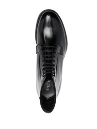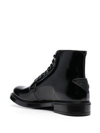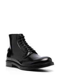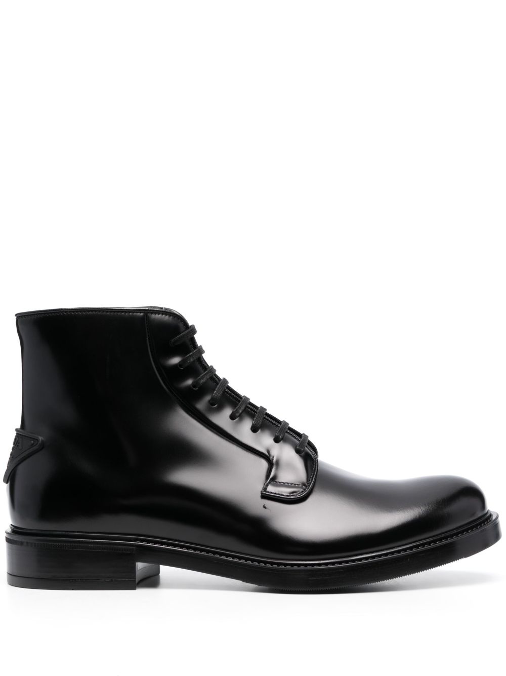 leather ankle boots These ankle boots speak to Prada's sleek and timeless style. Crafted from polished leather, the heel plays host to an embossed iteration of the iconic triangle logo — a ubiquitous motif that was first seen in 1913 on trunks designed by Mario Prada. Highlights - Black - Calf leather - Polished finish - Triangle logo - Embossed logo to the rear - Round toe - Front lace-up fastening - Ankle-length - Low stacked heel - Rubber sole Composition Sole: Rubber 100% Outer: Calf Leather 100% Lining: Calf Leather 100% SIZE & FIT Measurement HEEL 1.37 in(3.5 cm) HEIGHT 5.11 in(13 cm) Sole height 0.59 in(1.5 cm)