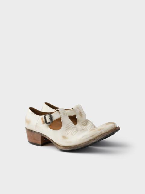 An innovative, hybrid language defines these shoes that reinterpret archetypal shapes with bold lines and details, inspired by western style. The pointy toe silhouette is made of natural grain leather emphasized by an antiqued effect that gives the shoes depth and uniqueness, an expression of authentic, instinctive style. - Product code: 2EA169_MJ0_F0048_F_X000 - With buckle - Upper with decorative stitching - Leather sole with rubber half-sole and heel layer with hot-stamped logo - Sole height: 53 mm - Leather insole - Imported MATERIALS Main material: Calfskin