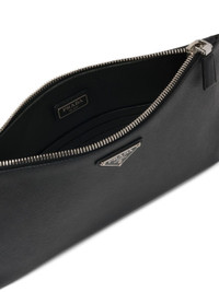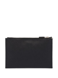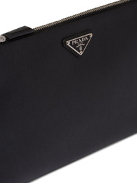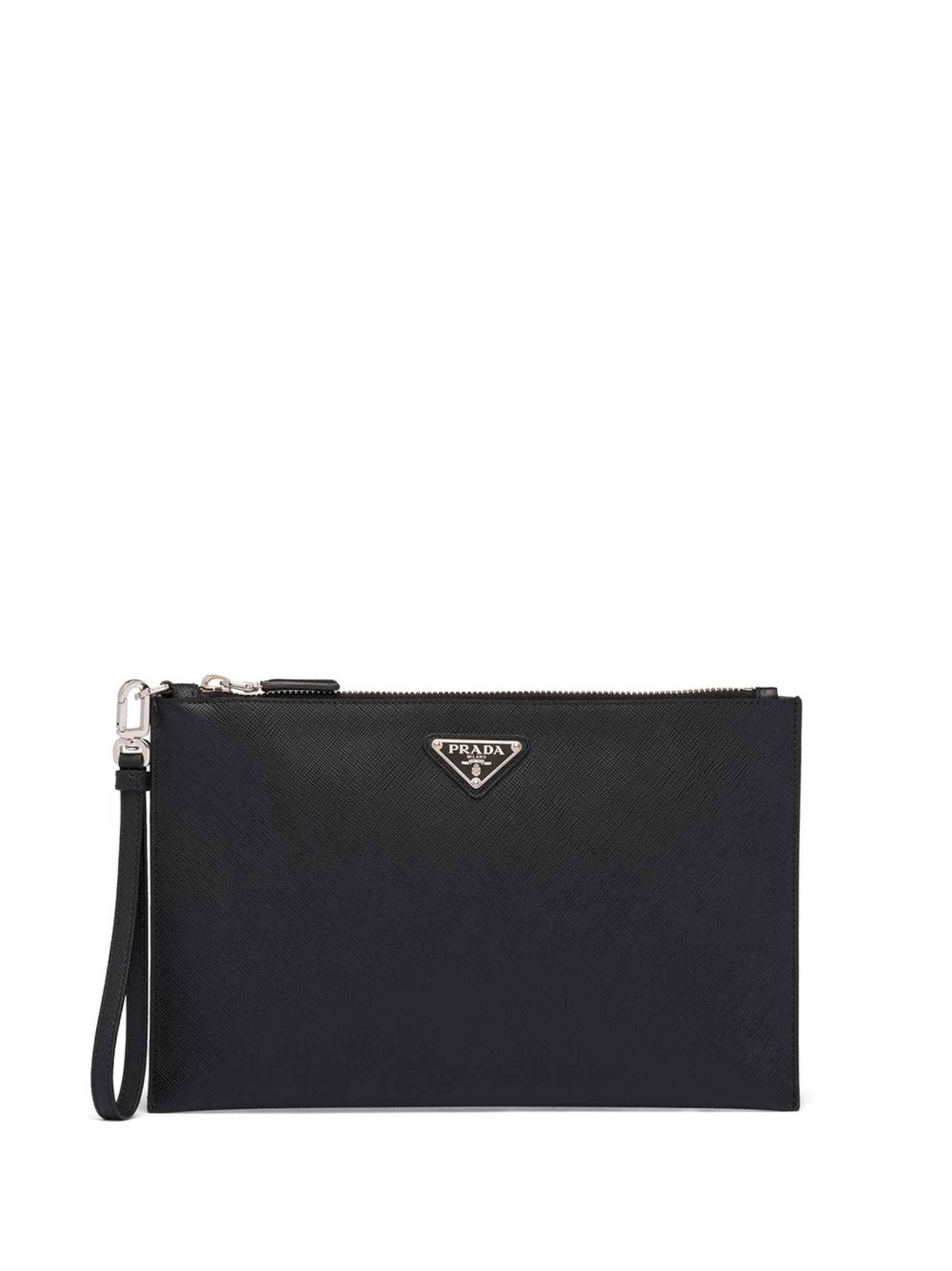 Black Saffiano leather logo plaque clutch from Prada featuring logo plaque, wrist strap, top zip fastening and internal card slots. Fabric and Care Designer Style ID: 2NH005PN9 Designer Colour: F0002 BLACK Composition: Outer: Leather 100%Made in Italy