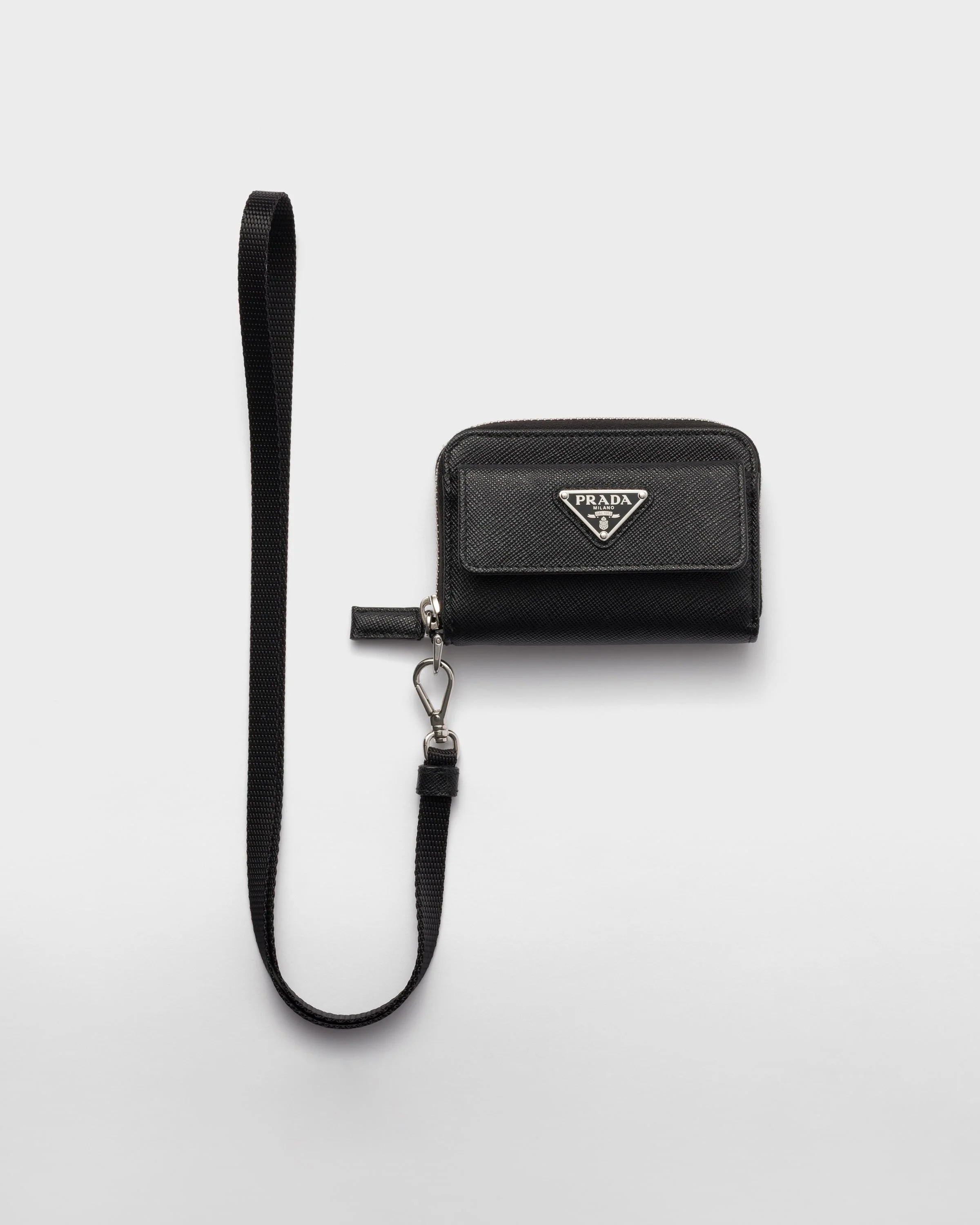 This sleek, pragmatic coin purse made of Saffiano leather features a design with an internal pocket and two card slots. The accessory with a convenient neck strap is decorated with the enameled metal triangle logo. - Product code: 2MR044_QHH_F0002 - Zipper closure - Enameled metal triangle logo - Two card slots - One internal pocket - External pocket with snap - Moire and Saffiano lining - Removable woven nylon tape neck strap - Imported Height: 7.5cm Width: 11cm MATERIALS Main material: Calfskin