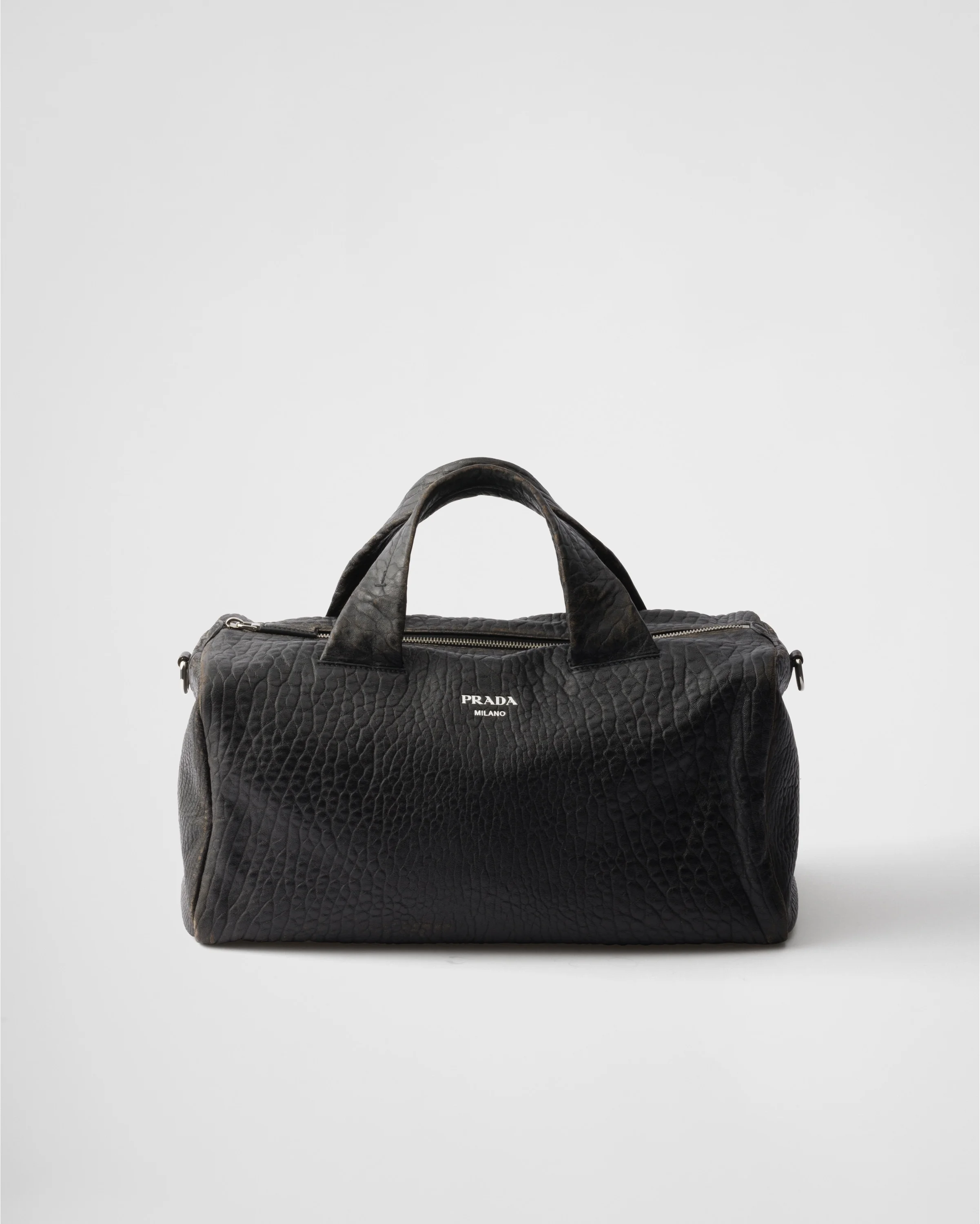 This duffle bag with a geometric, minimalist design embodies a contemporary and functional style. The soft touch of nappa leather enriches the roomy and refined accessory decorated with the lettering logo. - Product code: 2VC045_2C73_F0002_V_OOO - Leather handles - Detachable, adjustable leather shoulder strap with buckle. Maximum length 118 cm - Minimum length 105 cm - Maximum drop 54 cm - Minimum drop 45 cm - Printed logo on the front - Zipper closure - Interior with zipper pocket - Nappa leather lining - Imported Height: 20cm Width: 40cm Length: 20cm MATERIALS Main material: Lambskin