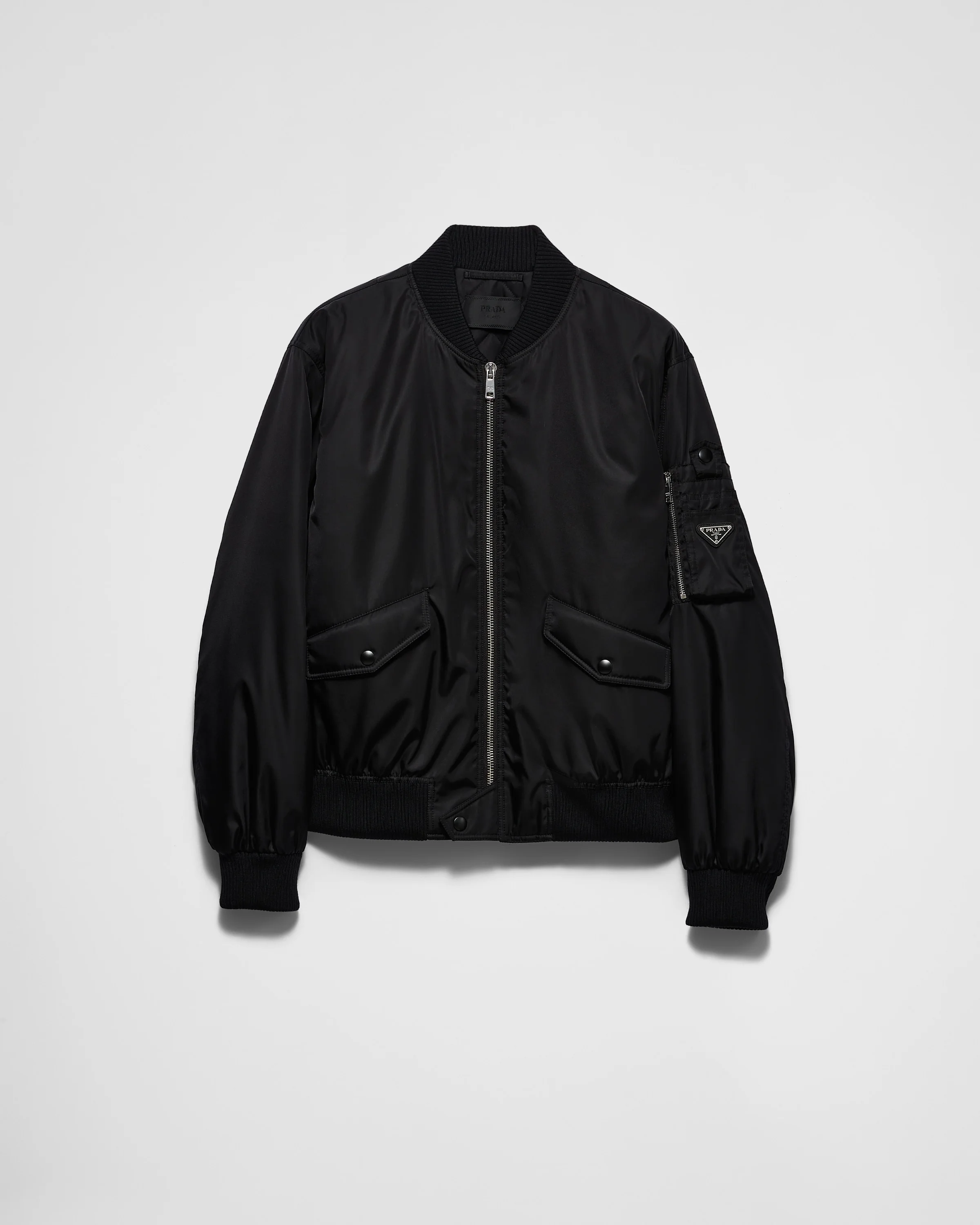 Soft volumes define the silhouette of this Re-Nylon bomber jacket featuring functional details and decorated with the enameled metal triangle logo. For sustainable care to preserve the product's characteristics and reduce microfiber shedding, we recommend not washing the item too often. Let the product air out after every use and have it dry cleaned at a specialized ecological dry cleaners. - Product code: SGC824_1WQ8_F0002_S_OOO - Regular fit - Ribbed knit collar - Straight sleeve - Zipper closure - Pockets with flap and button - Ribbed knit cuffs - Drop shoulder - Straight hem - Lined and quilted - Enameled metal triangle logo - The fabric is made with regenerated yarn obtained from recycled plastic materials collected in the ocean - Imported - The model is 189 cm tall and wears a size 48 Height: 65cm MATERIALS Main material: 100% recycled polyamide