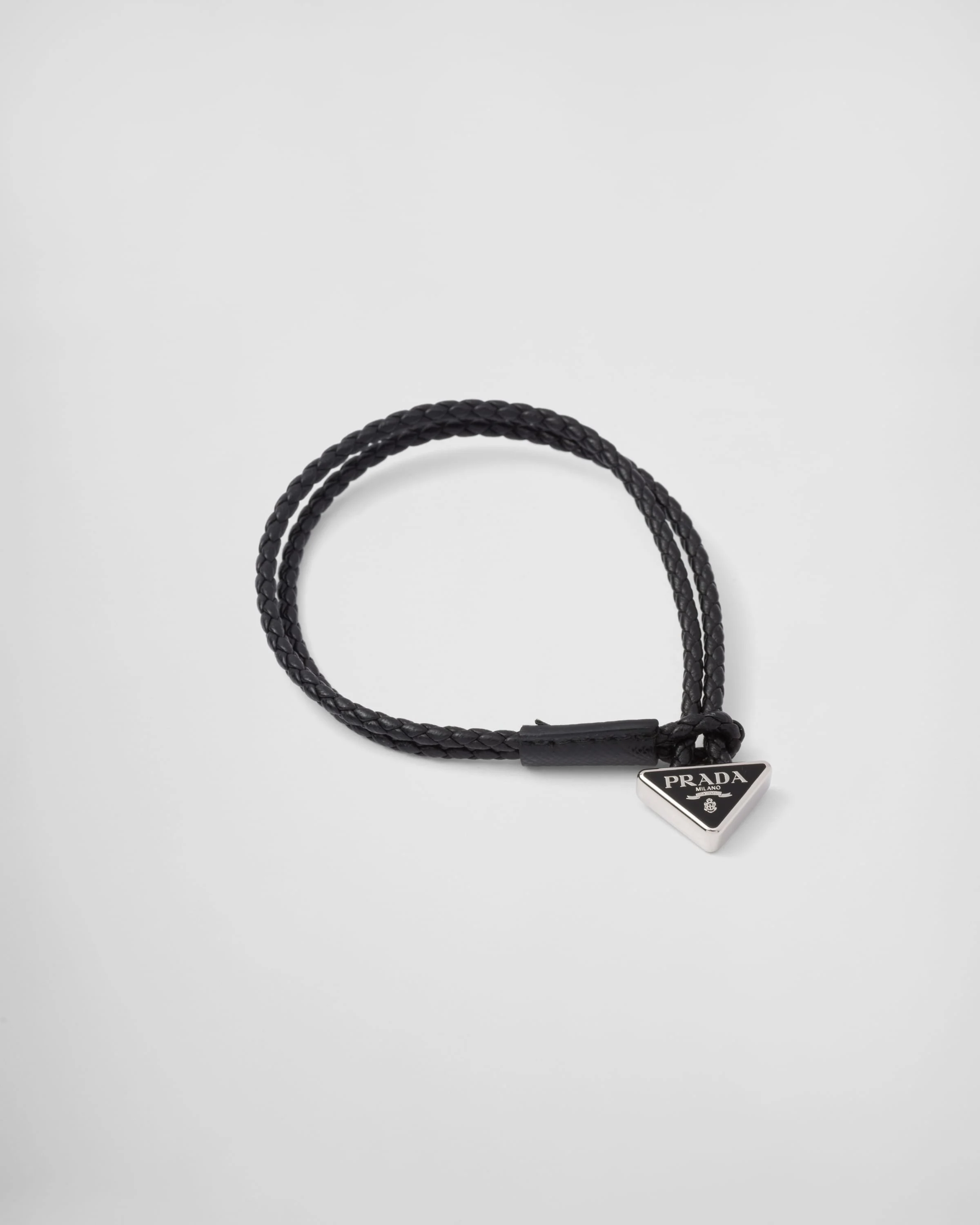 This braided leather bracelet is defined by its modern clasp with triangle logo. - Product code: 2IB288_038_F0002 - Enameled metal triangle logo - Imported MATERIALS Leather