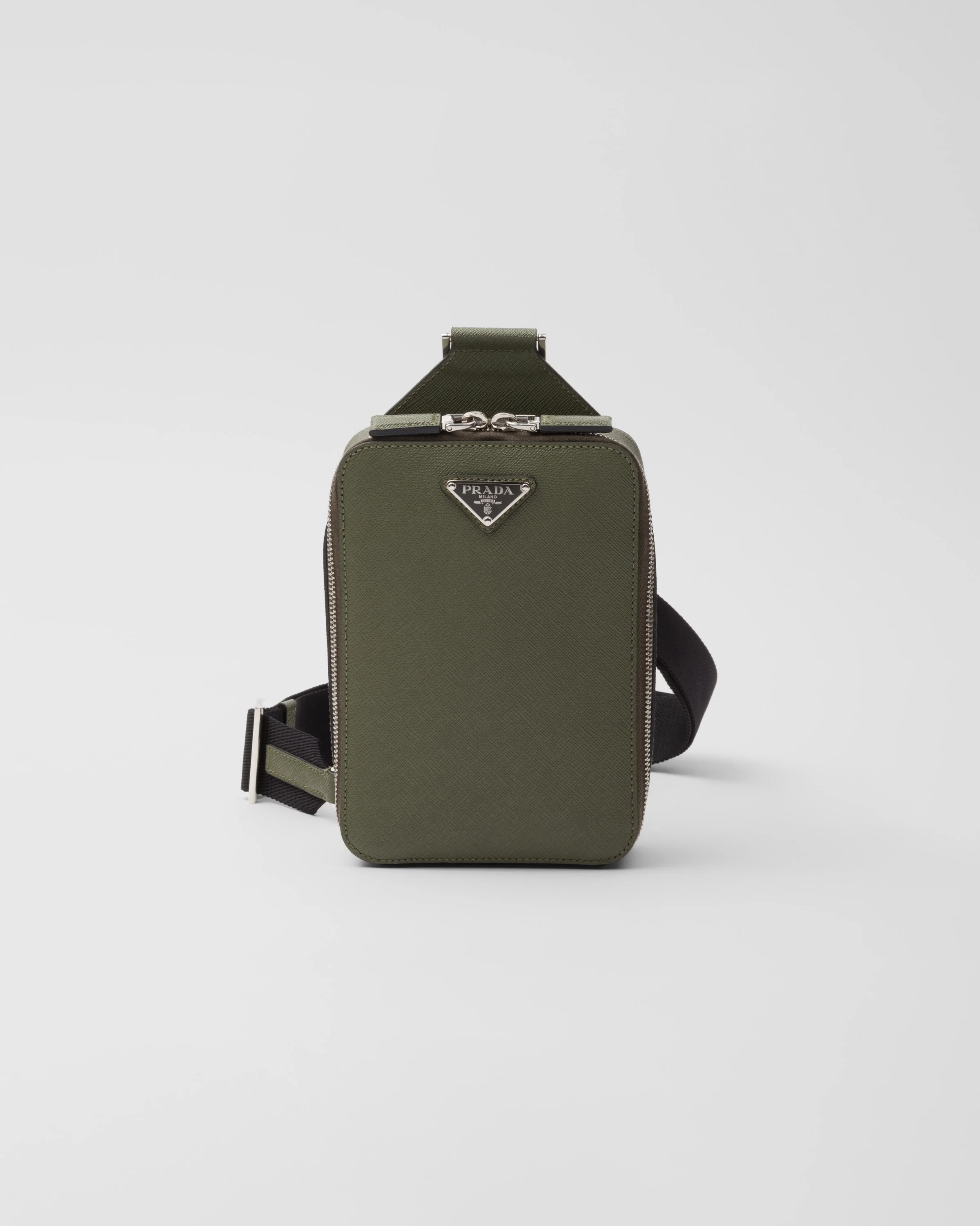 This elegant Saffiano leather shoulder bag with a handle, shoulder strap, and two zipper pockets has a sleek silhouette. - Product code: 2VZ106_9Z2_F0466_V_OOO - Adjustable nylon tape and leather shoulder strap - Enameled metal triangle logo on the front - Zipper closure - Interior with patch pocket - Logo-print nylon lining - Imported Height: 20cm Width: 14cm Length: 4cm MATERIALS Main material: Calfskin