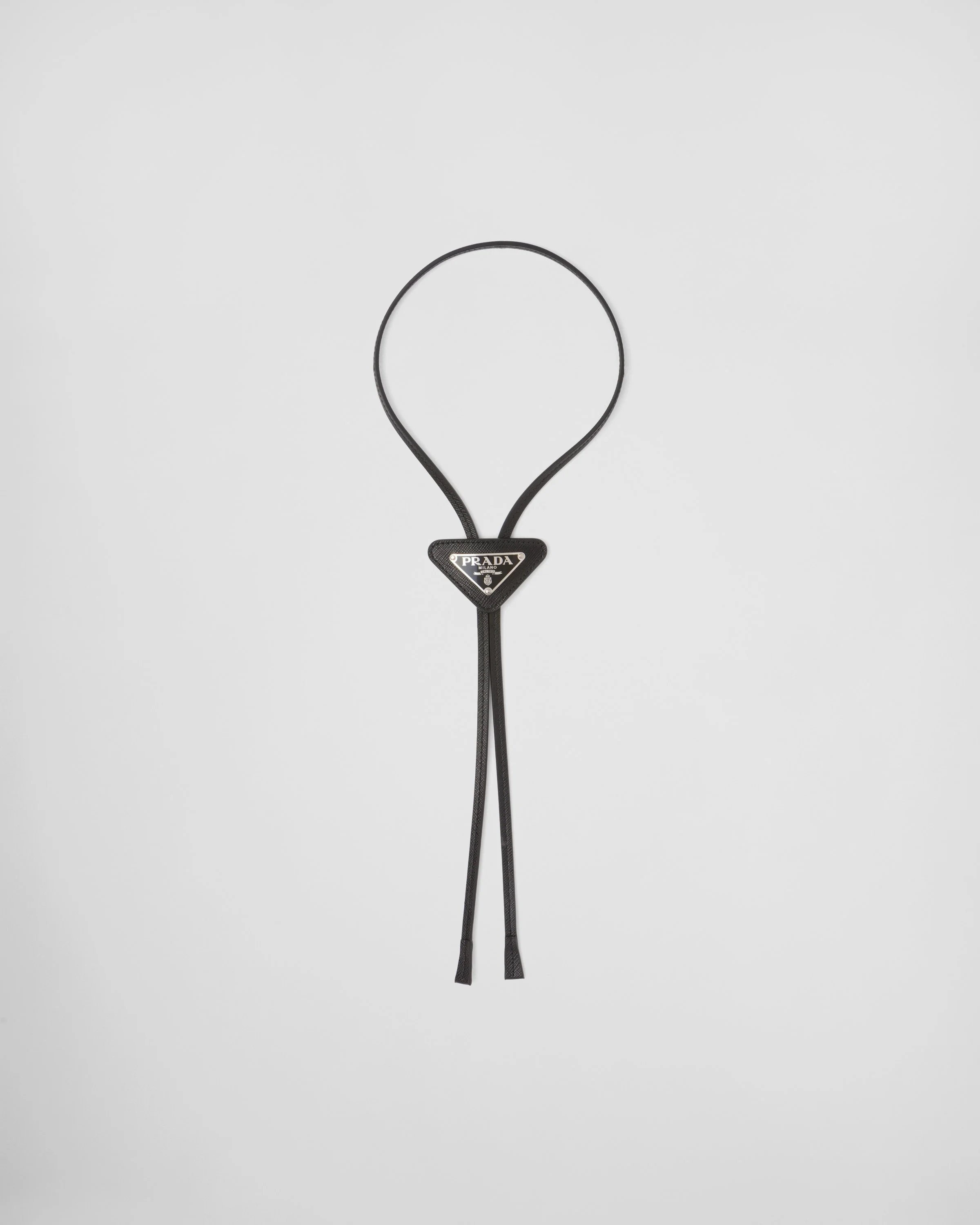 This Saffiano leather tie defined by the triangle logo is a must-have of the new season. - Product code: 2IC027_QHH_F0002 - Saffiano leather - Enamel triangle logo - Imported Height: 0.6cm Width: 90cm MATERIALS Leather