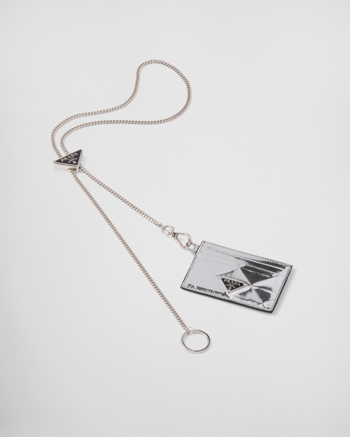 triangle-panel lanyard credit card holder A detachable and adjustable chain lanyard strap supports this mini card holder from Prada AW21. Produced in Italy from silver leather, it features a triangle panelled construction and signature logo plaque to the front. Composition Outer: Leather 100%