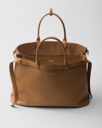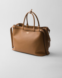 Clean lines and refined elements tell the story of Prada's dual aesthetic that blends simplicity and detail, functionality and elegance. This leather bag summarizes the brand's stylistic codes in a pragmatic but sophisticated design, with nappa leather interior. The spacious silhouette is animated by the distinctive touch of the leather belts, both refined and modern. The hot-stamped lettering logo in 22 kt gold leaf adds a precious signature to the bag. - Product code: 2VG126_2CYS_F03BH_V_OOO - Leather handles - Detachable, adjustable leather shoulder strap - Metal hardware - Lettering logo printed on the front - Nappa interior with center pocket - Imported Height: 34cm Width: 48cm Length: 18cm MATERIALS Main material: Calfskin