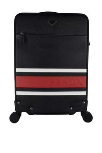 Prada cabin suitcase in black Saffiano leather. Two white and one red decorative stripe with Prada logo. Triangular metal logo. Zippered front pocket. One leather handle and one telescopic handle. Silver metal details. Four wheels. Zipper closure. Dimensions: 56 x 37 x 23 cm. 100% leather.