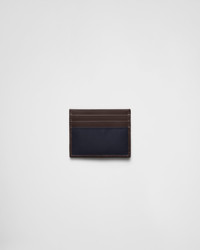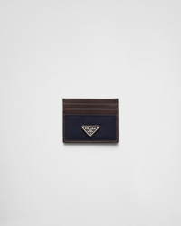 Sleek lines and iconic geometric shapes define this card holder made of leather and Re-Nylon, embellished with the enameled metal triangle logo. This product does not contribute to the SEA BEYOND educational program. - Product code: 2MC025_384_F0C1B - Enameled metal triangle logo - Six card slots - Internal pocket - Moire and leather lining - Imported Height: 8cm Width: 10cm MATERIALS Main material: Recycled polyamide