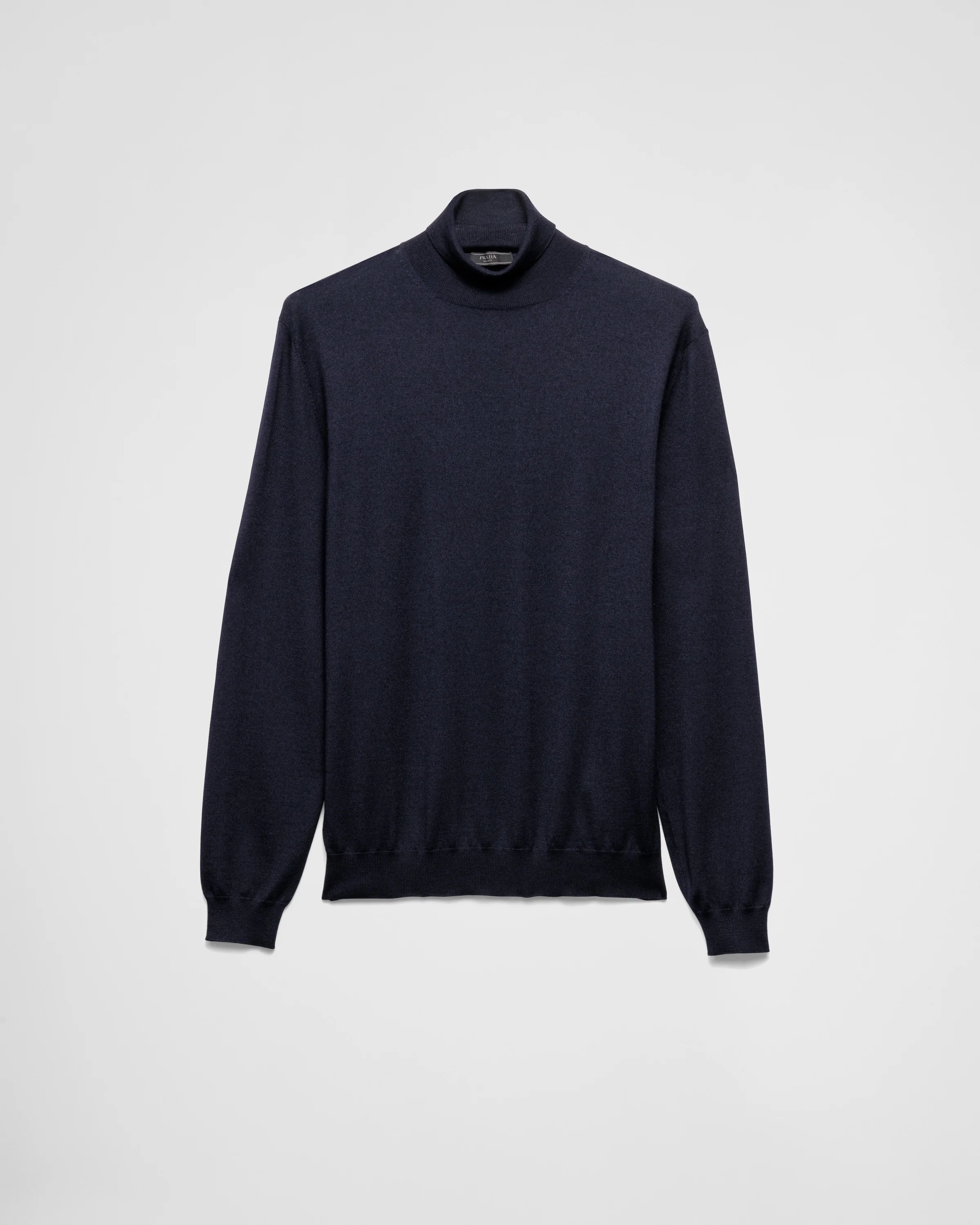 Made with a blend of fine cashmere and silk yarn, this turtleneck sweater embodies simple elegance and timeless style. - Product code: UMR651_0B8_F0008_S_OOO - Plain knit - Regular fit - Ribbed knit turtleneck - Raglan shoulder - Ribbed knit cuffs and hem - Knit triangle logo - Imported - The model is 188 cm tall and wears a size 48 Height: 66cm MATERIALS Main material: 30% silk 70% cashmere